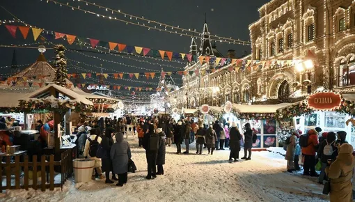 ГУМ-Ярмарка — та cамая картинка с новогодней открытки, которую можно увидеть своими глазами. В этом году ее украсили в стиле дымковской игрушки. За сказочную атмосферу отвечают разноцветные деревянные теремки, карусели и каток, а согреться можно блинами, пончиками и пирогами с горячими напитками.