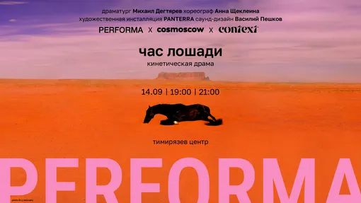 14 сентября в рамках ярмарки современного искусства Cosmoscow фестиваль PERFORMA представит кинетическую драму «Час лошади» — событие в коллаборации с Context. Diana Vishneva и инсталляцией от мультимедиа художников PANTERRA. Постановка на языках танца и медиа исследует состояние перехода от живого к механическому, от природного к алгоритмическому, а зритель становится свидетелем пластического исследования темы взаимодействия человека с новыми формами разума, а также его ощущений на фоне ускоряющегося прогресса. Кто разделит судьбу укрощенной лошади в будущем — искусственный интеллект или же его создатель? Ответом на этот вопрос становятся строки культового стихотворения Ричарда Бротигана «All Watched Over by Machines of Loving Grace» — утопического манифеста и одновременно ироничного реквиема будущему симбиозу машины и человека.