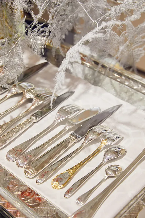 Ножи, вилки и ложки – это лишь часть семейной коллекции серебра. Французы редко покупают всю серию разом. Они предпочитают наслаждаться лотами постепенно. Это может быть «подписка» на сервиз и посвящение, которое родители оформляют детям. Базу можно собрать самостоятельно, объединяя современные предметы и антикварные варианты. Тогда это станет по-настоящему семейным столовым серебром. Было бы легко пойти и сразу всё купить, но это интересно, материально затратно и, к тому же, невозможно. Ваш вкус и образ жизни, как и уют вашего дома всегда должны оставаться вашими... За приборами нужно обязательно ухаживать: регулярно их чистить, натирать, любоваться собой в их зеркале. К этому приятно привыкаешь. Для чистки существуют специальные жидкости, их всегда можно купить у производителя серебра. Например, у Christofle она представлена в 4-х видах. Но если вдруг купить ее вовремя не удалось, у меня есть секретный совет: подходит и отбеливающая зубная паста. И, надо сказать, есть много народных рецептов: рекомендации бабушек никто не отменяет.