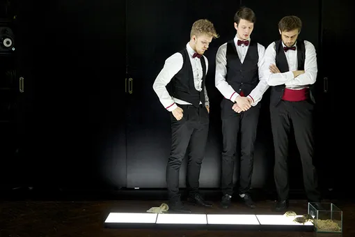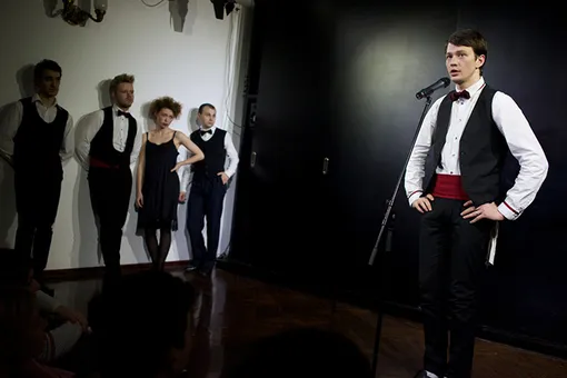 Текст – вначале Гоголя: есть у него крохотная пьеска «Лакейская», которую Добрыгин нашпиговал вкусными кусочками из «Мертвых душ» и «Ревизора». Но вдруг начинается вторая часть – гоголевские лакеи выходят к микрофону, и каждый рассказывает свою историю: как стал официантом, личным водителем и т.п, то есть лакеем современным. Истории невыдуманные, взяты будто из фейсбука (Социальная сеть признана экстремистской и запрещена на территории Российской Федерации) или «Большого города». И тут становится ясно: Гоголь с его странной малоизвестной пьесой на фиг не нужен. Захватывает именно это – болтовня ребят, добившихся в Москве статуса обслуживающего персонала. Сейчас очень популярен в театре такой жанр – вербатим: рассказ от первого лица при минимуме сценического действия. Потому что вся драматургия – в искреннем тексте.