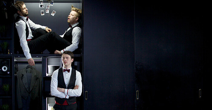 Спектакль миниатюрный, идет на сцене репетиционного зала Маяковки. Молодые актеры в буквальном смысле умещаются в шкафу. Этот многосюжетный шкаф придумал Григорий Добрыгин – да-да, тот самый, который главный герой в «Черной молнии». Он еще и режиссер по образованию, и это его постановочный дебют.