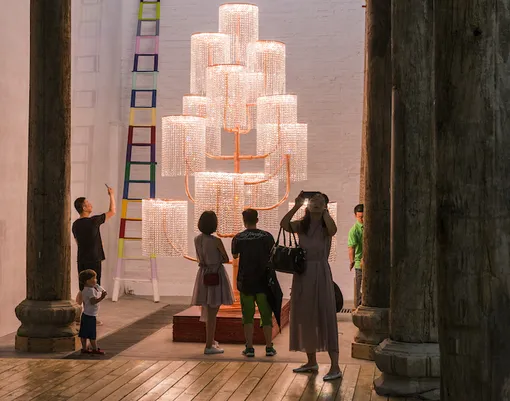 Куратор Цуй Цаньцань разделил выставку на две части: «Ай» расположена в самой Galleria Continua, а «Вэйвэй» – в центре Tang. Она включила в себя, в числе прочего, церемониальный дом династии Ванг, созданный четыре века назад. Под ним расположилась скульптура Chandelier – светильник из меди и хрусталя, высотой превышающий человеческий рост минимум в три раза. Все из того же хрусталя выполнено основание одной из колонн: Ай Вэйвэй вновь показал нам свое увлечение архитектурой, собрав на выставке элементы зданий династии Мин или современных сооружений. Окрашенные в непривычно яркие цвета или показывающие жухлый от времени цвет древесины, они поддерживают то социально-политическое послание, которое художник мастерски зашифровал в своих работах. Без него – нет никакого Ай Вэйвэя.