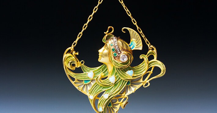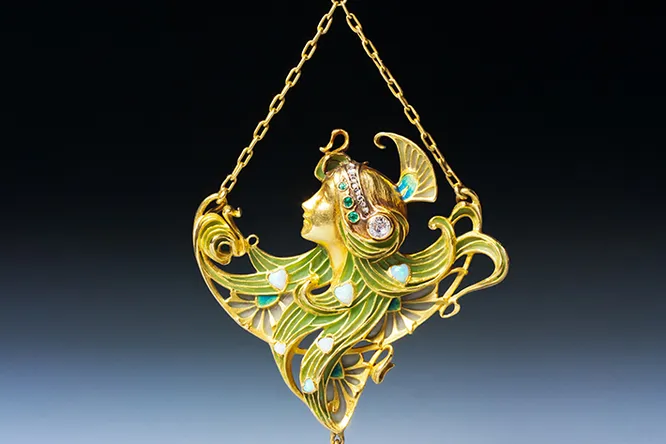 Л. Готре. Кулон в стиле ар-нуво (золото, эмаль, опал, изумруд, жемчуг, бриллианты). Около 1900