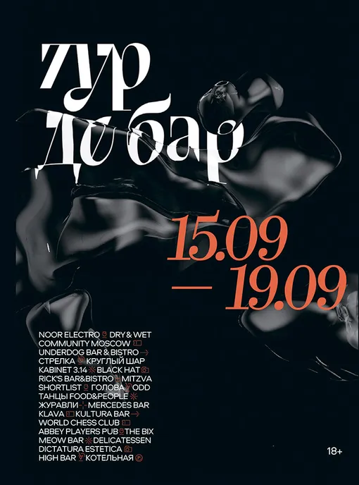Уже завтра в Москве начинается первый столичный фестиваль бар-хоппинга. Как все будет устроено: вы покупаете один билет, который дает вам один бесплатный напиток в каждом из баров-участников, прокладываете удобный маршрут и просто показываете билет у барной стойки. Кто участвует: Noor Electro, Котельная, Klava, Shortlist, Голова, Meow Bar — вот лишь начало внушительного списка. Подписывайтесь на аккаунты tour de bar в соцсетях и следите за анонсами специальных событий, которые организаторы подготовили для ценителей барной культуры.