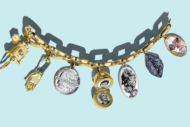 Браслет «Charmed». Слева направо: подвески по дизайну Лори Симмонс, Ширин Нешат, Барбары Крюгер, Синди Шерман, Рейчел Фейнштейн, Микалейн Томас, Вонгечи Муту.