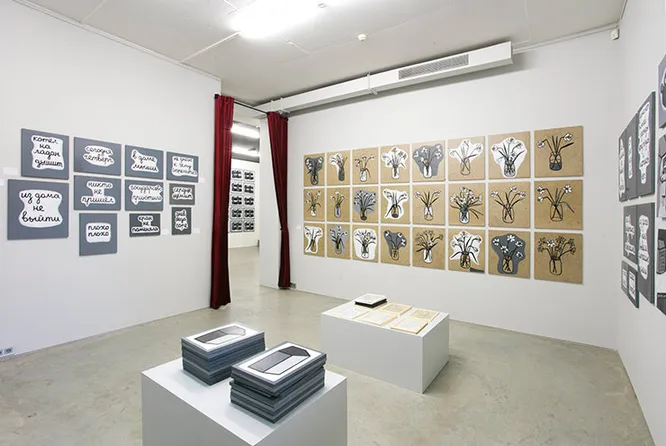 «Это чисто больничные надписи, в повседневной жизни они не возникают. В клинике у меня всегда с собой тетрадки и ручки, я что-то записываю. Когда сидишь и тупишь в этой больнице, так пишется само: строчки образуют форму. Это сделано по эскизам больничной тетрадки. Поэтому перед нами все-таки не тексты, а картины. Эти таблички не должны вызывать жалости и сострадания, они, наоборот, позитивные: написал, прочитал, смирился».