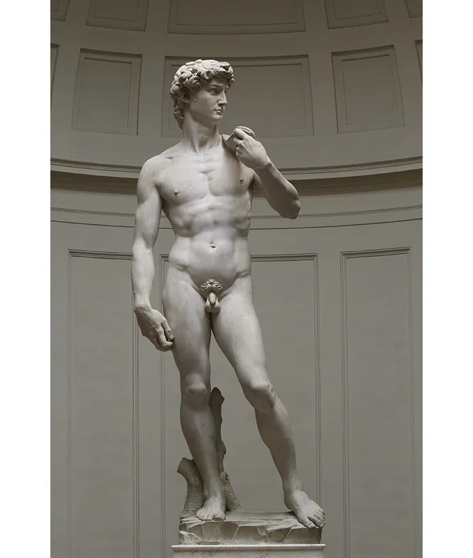 Древние греки кое-что соображали в идеальных телах — неудивительно, что именно они придумали самую выгодную позу. Перенесите вес на одну ногу, а вторую слегка отведите в сторону или назад. При этом бедро опорной ноги само слегка приподнимется — так в представлении античных мастеров выглядит самое правильное физическое равновесие. Современные модели, прежде чем развернуться у края подиума, тоже демонстрируют прием контрапоста. Но ни одной из них не переплюнуть «Мистера Совершенство — 1504» — «Давида» Микеланджело.