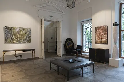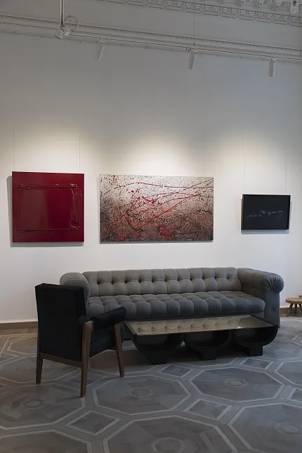 Галерея «Тираж 1/1», где проходит выставка, находится на первом этаже пятиэтажного жилого дома. В коллекции можно найти актуальное искусство, современный коллекционный дизайн и французский модернизм. Наполненное воздухом пространство, белые стены и замысловатая лепнина на потолке создают впечатление элегантной парижской квартиры.
