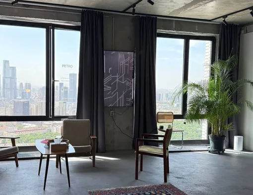 Пространство «Сабстанция», открытое куратором Сабиной Чагиной в прошлом году, расположилось в ЖК «Пресня Сити». Это не только галерея, но и открытое хранение арт-объектов, и небольшой магазин, где можно приобрести тиражные предметы современного искусства. Серые бетонные стены, панорамные окна в пол и урбанистический пейзаж «даунтауна» — глядя на небоскребы с высоты 42-го этажа, невольно ощущаешь себя жителем Нью-Йорка.