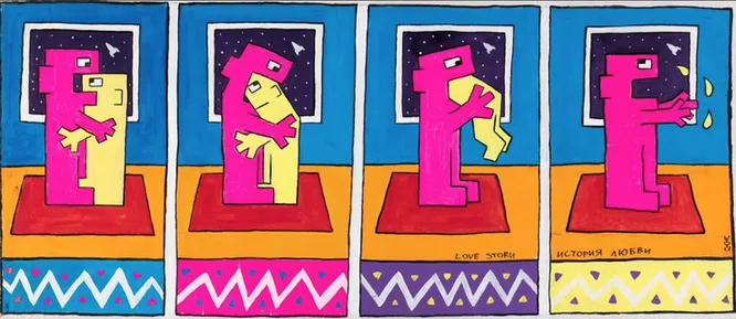 Из работ Цоя можно сложить огромный комикс — в большинстве из них есть нехитрый сюжет и даже надписи. Часто художник изображает прозаичные сценки, но с обязательным налетом сюра. Например, четырехчастная работа Love Story изображает целующуюся парочку — все бы ничего, но в конце концов одна фигурка пожирает другую. Цой «буквализирует» простую истину: в порыве чувств мы рискуем раствориться в другом человеке и потерять себя. Любовный сюжет в работах Цоя возникает частенько — парочки то нежатся в постели, то бегут навстречу друг другу.