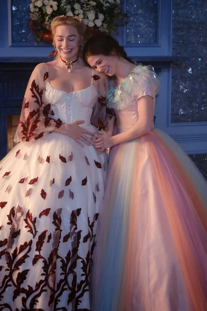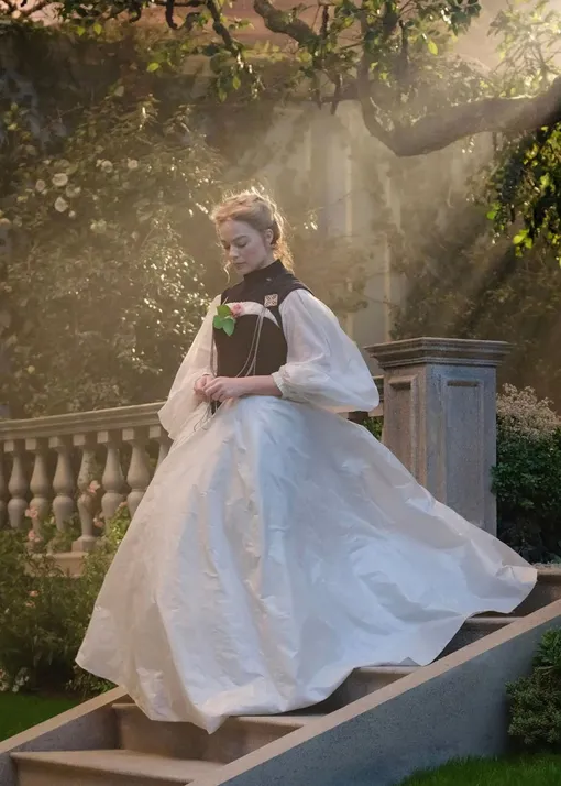 Всего в кадре Марго Робби сменила около 50 костюмов, то есть в скандальном трейлере мы не увидели даже половины того, что готовит нам картина. Важным визуальным кодом гардероба экранной Кэти становится красный цвет. Цвет любви и страсти, который так украшает актрису и позволяет ей все время оставаться в центре внимания в любом кадре: окружена ли она еще десятком людей или находится в абсолютном одиночестве. Цветовыми акцентами служат и бархатная накидка с капюшоном (один из наиболее исторически достоверных элементов гардероба героини), и цветочный узор на корсете, и лента на шляпе для пикника, и, конечно, ненавидимая пользователями сети пышная латексная юбка. Она, к слову, вовсе не латексная, а просто сшита из синтетической блестящей ткани, как и черное «металлическое» платье. Для Дюран использование очевидно современных материалов в сочетании с викторианскими фасонами стало способом вывести историю за пределы каких-либо временных рамок, продолжая идею Феннел. Действие ее «Грозового перевала» разворачивается не в одной конкретной, а во всех эпохах одновременно, и каждая из них привносит что-то свое в образы героев.