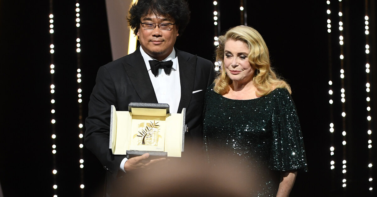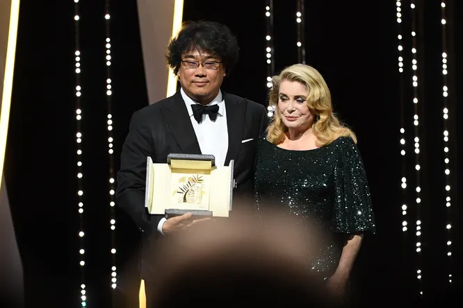 Режиссер Пон Чжун Хо с Золотой пальмовой ветвью за фильм «Паразиты» и Катрин Денев на сцене во время церемонии закрытия 72-го ежегодного Каннского кинофестиваля 25 мая 2019 г. в Каннах