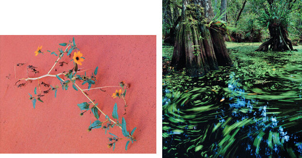 «Журнал National Geographic попросил меня сделать фоторепортаж, как коренные американские племена управляют своими земельными ресурсами. Мне захотелось сфотографировать Большой кипарисовый заповедник во Флориде. Но, изучив множество изображений болотистой местности, я понял, что нужна другая концепция. Ведь съемку мне поручил National Geographic. Статья была посвящена движению воды по кипарисовому болоту. Опустившись на колени, я внимательно наблюдал за водой. В то же время я заметил незначительное движение папоротников, плавающих на поверхности. Они и оказались в центре моего внимания. Я решил: чтобы изобразить слабое движение воды, нужна исключительно длинная выдержка. Мне пришлось использоватьи поляризационный и нейтральный светофильтры, чтобы достигнуть выдержки в две минуты. Когда проявили пленку, пестрые листья, кружащиеся по поверхности воды, создали совершенно новый сюжет. Хотя линии не прямые, они визуально отделяют стволы кипариса и постепенно переключают внимание зрителя на болото».