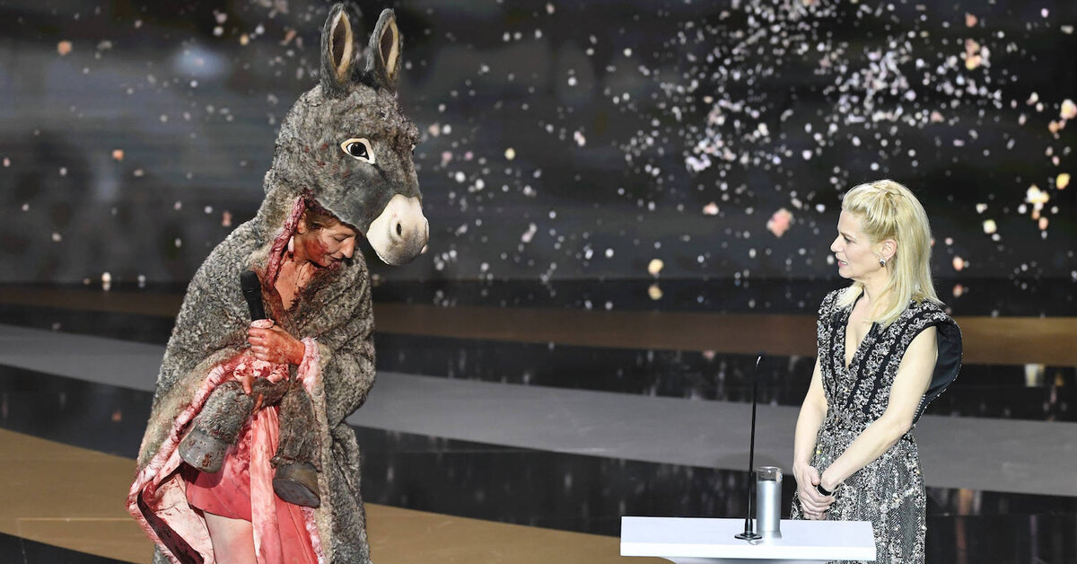 Далее девушка устроила целый перфоманс. Она произнесла речь в поддержку активистов, которые выступают во французских театрах за то, чтобы в стране открыли культурные учреждения. Они закрыты уже год из-за пандемии коронавируса. После своих слов Корина Масьер скинула ослиную шкуру и осталась в одном платье-комбинации, облитом красной краской.
