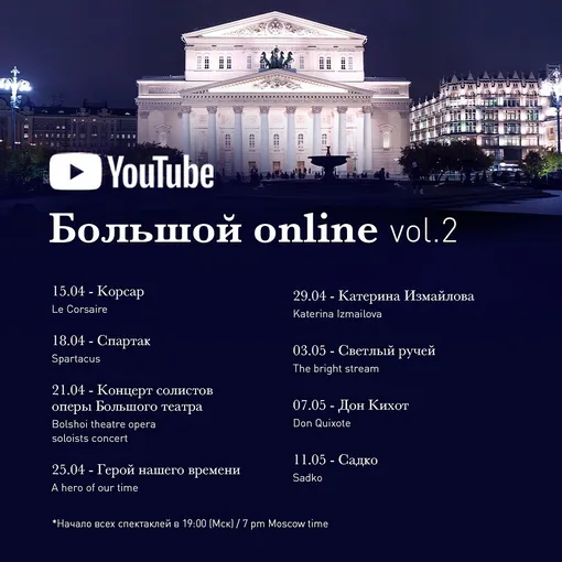 Новые онлайн-показы также будут начинаться в 19:00 по московскому времени и останутся доступны для просмотра в течение 24 часов. Генеральный директор театра Владимир Урин подчеркнул, что показы приносят радость людям в это непростое время.