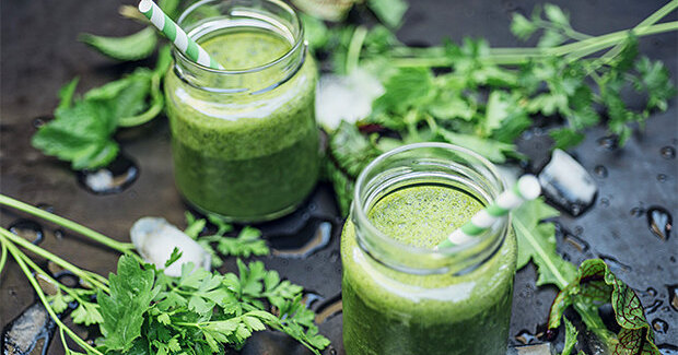 Пропустить через соковыжималку 4 небольших огурца, 3 стебля сельдерея, небольшой корень имбиря и половинку лимона. Получившийся сок наливаем в блендер, добавляем туда 5 веточек петрушки и 5 листьев шпината.