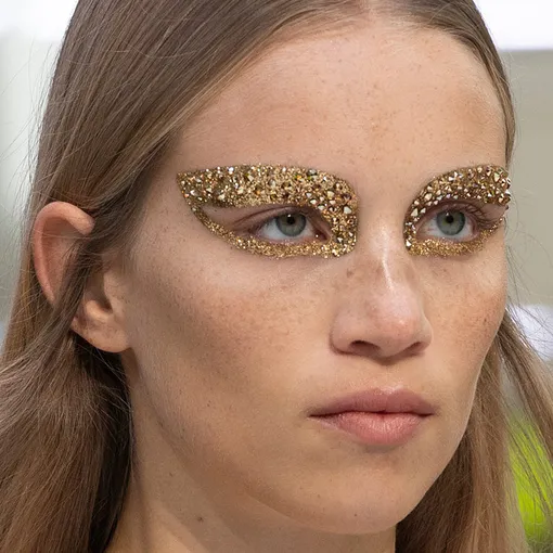 Традиционно за бьюти-образы на шоу Valentino отвечает женщина-легенда Пэт МакГрат. Для показа сезона весна-лето — 2020 вместе с Пьерпаоло Пиччоли они воплотили в жизнь смелую задумку. Вместо примитивных смоки и стрелок визажисты нарисовали моделям импровизированные «очки» из золотого глиттера и страз. По форме рисунок напоминал cat eye — с вытянутым уголком у брови. У некоторых моделей была light-версия: искрящимся золотом были покрыты брови и нарисованы «острые» стрелки. Тот самый случай, когда глаза действительно горят. Хорошие новости: все средства, с помощью которых выполнен макияж, можно будет приобрести в линейке Pat McGrath Labs.