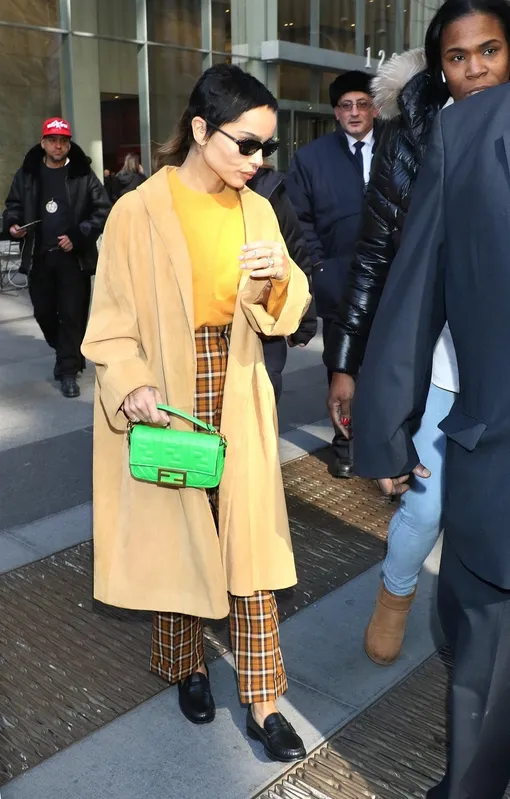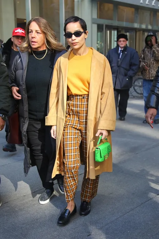 Зои Кравиц претендует на звание модного инфлюэнсера: наряды 31-летней актрисы и певицы все чаще приковывают наше внимание. Так вышло и с этим небанальным базовым образом на каждый день. Зои вдохновилась эстетикой гранжа 90-х и надела ключевую вещь той эпохи - брюки с высокой талией в английскую клетку. Она дополнила их апельсиновым свитером и плащом оверсайз по моде будущей весны. Но кульминация ее образа - неоново-зеленая сумка Fendi модели Baguette, которая добавила яркий акцент этому повседневному комплекту. В солнечный февральский день Зои надела винтажные очки мамы Лизы Боне родом из 90-х в массивной пластиковой оправе: в этом сезоне такие должны быть у всех.
