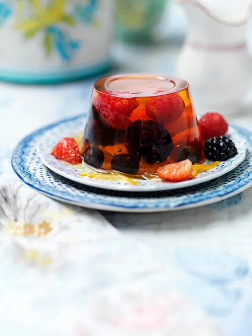 Чтобы оно было максимально полезным, понадобится не вода, а 600 мл натурального яблочного сока. А также 15 граммов желатина (он очень полезен для здоровья, а веганы могут выбрать растительный вариант из агар-агара) и свежие фрукты для украшения. На медленном огне желатин разогреваем с соком до полного растворения. Тем временем выкладываем фрукты в креманку. Заливаем смесью сока с желатином и ставим в холодильник до полного застывания.