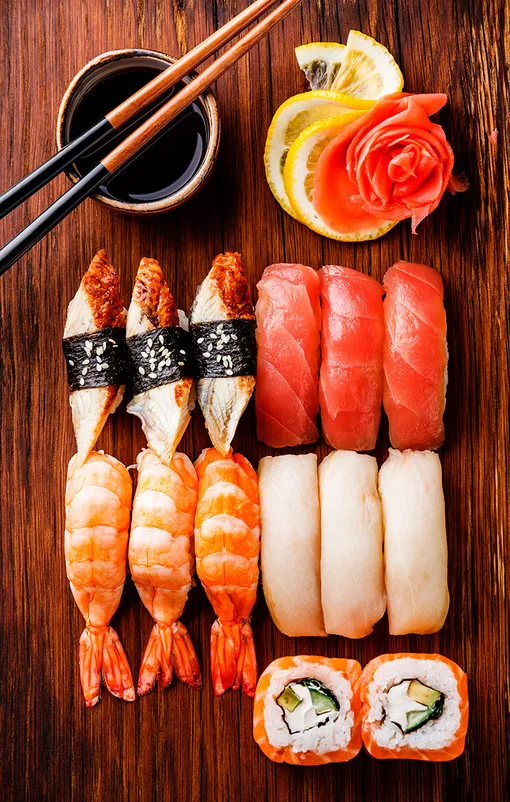 Суши — завсегдатай рационов питания многих известных моделей, однако подходить к их употреблению нужно с особой осторожностью. Средняя порция даже самых «диетических» суши (нори, рис, рыба, овощи) по калорийности эквивалентна гамбургеру. Добавьте к этому еще соевый соус, имбирь и васаби, при приготовлении которых используют сахар и крахмал, и вот вы уже рискуете выйти за рамки дневной нормы.