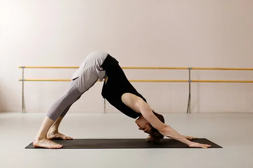 Из позы собаки головой вниз на выдохе переходим в планку, ладони под плечами, локти разворачиваем назад вдоль тела. В планке делаем вдох, на выдохе опускаемся в нижний упор (упрощенный вариант с опорой на колени), на вдохе переходим в позу собаки головой вверх (отталкиваемся стопами от пола, живот подтянут). На выдохе возвращаемся в позу собаки головой вниз, поднимая и уводя таз назад. Количество повторений — от 10 до 15 раз, в зависимости от вашей физической подготовки.