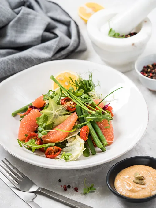17:00–18:00 Микс из кенийской фасоли, листового салата с соусом гамадари и красного апельсина