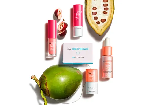 My Clarins дебютировали с коллекцией декоративных средств. Это натуральные подходящие в том числе для веганов средства на основе экстрактов растений: ягод годжи, питательными маслами какао, клюквы и кокоса. А самое главное - удобные. Сюда вошли жидкий хайлайтер с деликатными перламутровыми пигментами, кремовые румяна в стике в двух натуральных оттенках, палитра для бровей, бальзам, усиливающий естественный цвет губ, адаптируясь к уровню pH, и сочный блеск для губ.