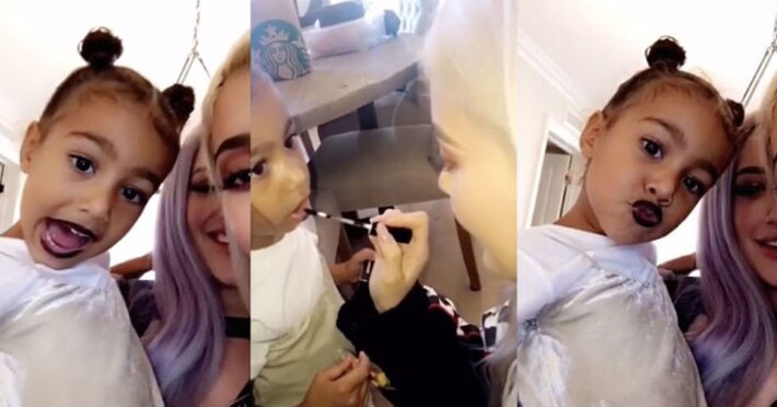 В своем Snapchat Кайли Дженнер поделилась снимками, на которых она заботливо красит губы своей племяннице Норт Уэст. Для beauty-эксперимента 3-летняя дочь Ким Кардашьян и Канье Уэста выбрала черный цвет помады из линии косметики Кайли Kylie Cosmetics. Судя по видео, на котором запечатлена буквально визжащая от восторга Норт, выбор в пользу черного был ее самостоятельным решением. Видимо, любовь к эпатажному макияжу девочка унаследовала от своей мамы – яблоко от яблони не далеко падает.