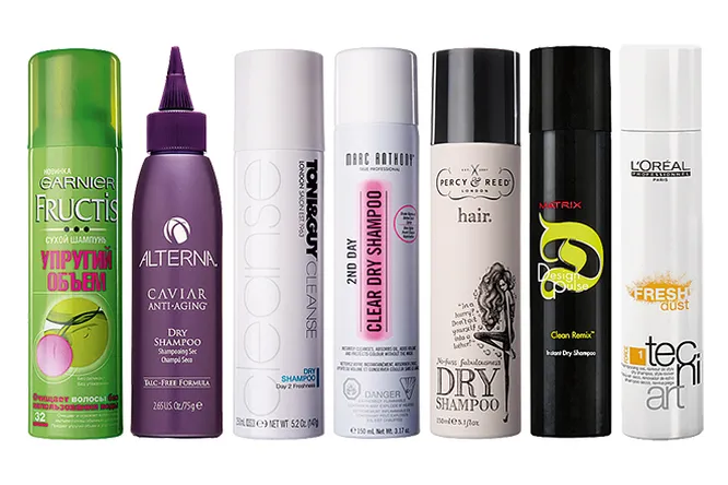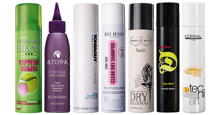 Сухие шампуни (слева направо): Garnier Fructis «Упругий объем»; Alterna Caviar Anti-Aging Dry Shampoo; Toni&Guy Hair Meet Wardrobe Cleanse Dry Shampoo Day 2 Freshness; Marc Anthony Clear Dry Shampoo 2nd Day; Percy & Reed No-fuss Fabulousness Dry Shampoo; Matrix Design Pulse Clean Remix; L'Oréal Professionnel Tecni Art Fresh Dust.