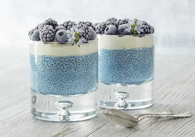 Пудинг чиа с кокосовым молоком, манго и клубникой