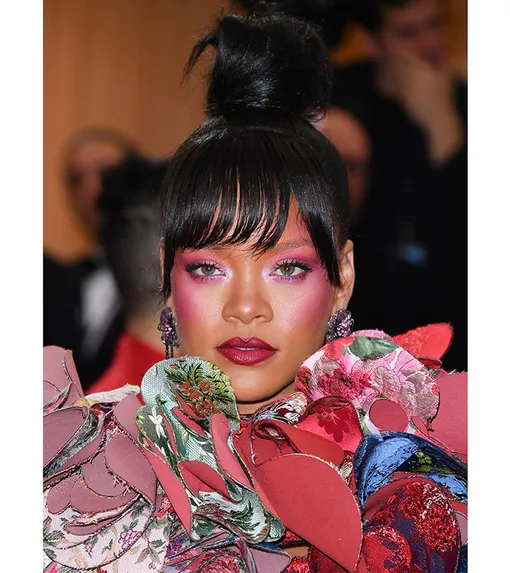 То, что Рианна не боится экспериментировать с внешностью, мы усвоили давно. Бал этого года не стал исключением. Объемное платье-оригами Comme des Garçons, закономерно превратившееся в мем, дополняли ярко-розовые румяна, нанесенные в технике дрейпинг. А вот с прической РиРи на удивление поскромничала — волосы были убраны в высокий пучок.
