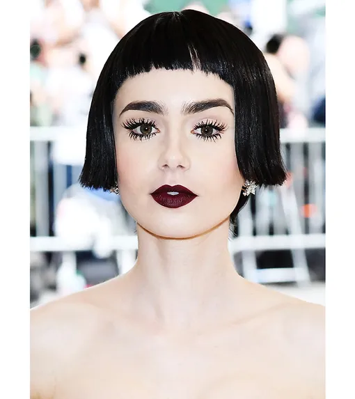Прическа Лили Коллинз очень уж напоминает фирменную стрижку вдохновительницы вечера - Рэй Кавакубо. Случайность? Не думаем. Готичности добавила помада темно-бордового цвета и густо нанесенная тушь.