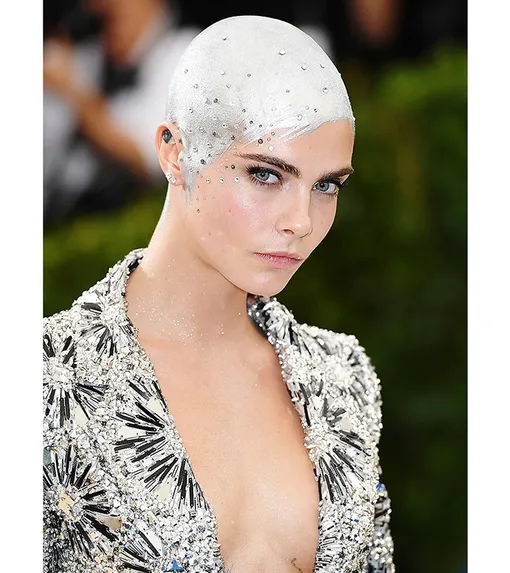 Пальма первенства за самую необычную прическу, бесспорно, принадлежит Каре Делевинь. Свежевыбритую голову Делевинь покрасила серебряной краской и усыпала ее стразами.
