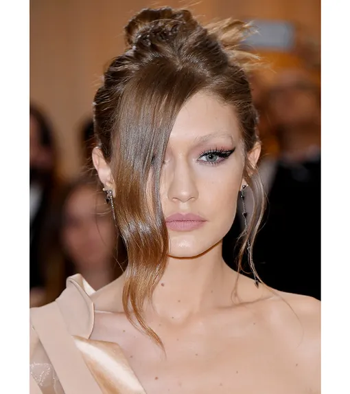 Красотка Джиджи отдала предпочтение экстремальным стрелкам. И не прогадала. В дополнение к яркому макияжу глаз — сложносочиненный пучок и длинная челка, закрывавшая половину лица.