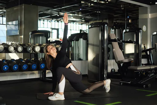 Из положения «планка» сделайте широкий шаг с внешней стороны от ладони. Одноименной рукой прочертите круг от пола до потолка. В финальном положении максимально удлинитесь за рукой вверх, повернув плечи в сторону колена. Для улучшения стабильности сзади стоящую ногу можно опустить на колено. В среднем темпе на каждую сторону выполните 8-10 повторений.