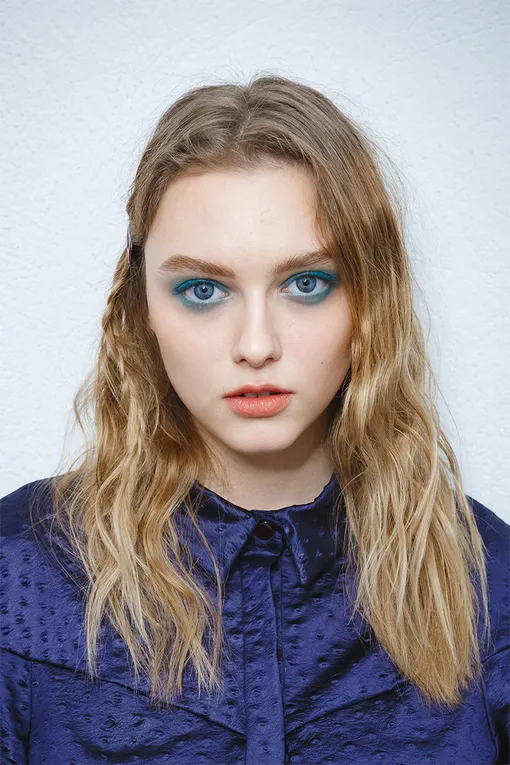 Главный акцент был сделан на глаза: насыщенного голубого цвета удалось добиться с помощью сезонной новинки - ручки-подводки для глаз и губ Stylo 4 Couleurs 03. При ярком макияже глаз очень важен идеальный тон лица. В ход пошли база под макияж, придающая сияние коже SOS Primer, 01 Universal Light, устойчивый тональный крем в подушечке Everlasting Cushion SPF 50, минеральная рассыпчатая пудра Multi-Elat и коллекционная бронзирующая пудра Poudre Soleil. Губы приобрели оттенок теплого песка при помощью матовой помады Joli Rouge Velvet 758 V.
