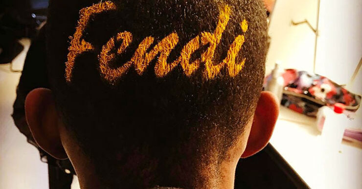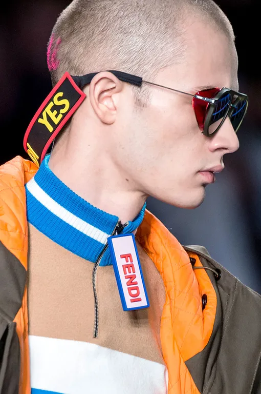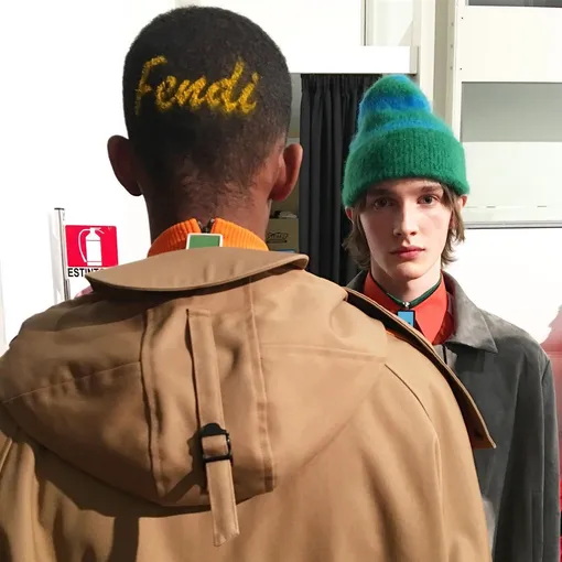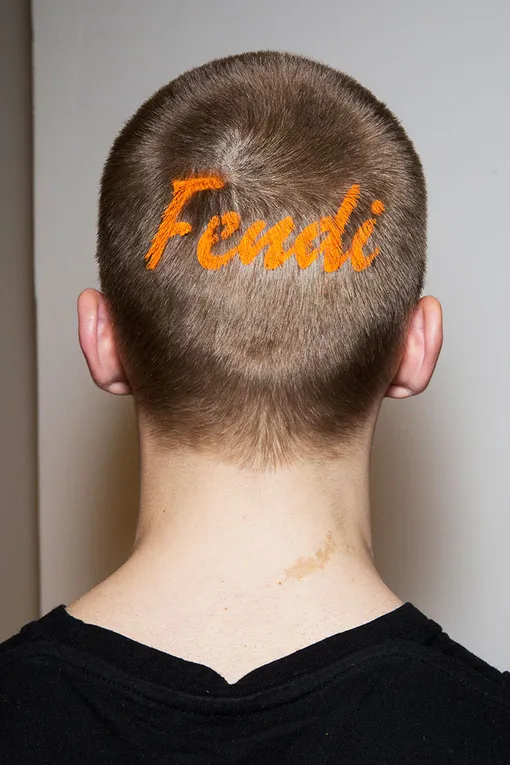 На показе Fendi в рамках текущей мужской недели моды в Милане стилисты очень оригинально обыграли тренд на логоманию. Логотип бренда мелькал не только на аксессуарах, обуви и некоторых предметах одежды, но и на волосах моделей. Каллиграфически написанное название марки было выведено на головах моделей всеми цветами радуги. За воплощение такой креативной идеи отвечал знаменитый стилист по волосам Мэтт Малхолл, работавший с Burberry, Lanvin, Rag & Bone и другими. Кстати, такой «мейкап для волос» довольно просто повторить в домашних условиях, причем не только на коротко стриженных волосах. Для этого понадобятся трафарет с надписью, цветной спрей или мелки для волос и лак самой сильной фиксации.