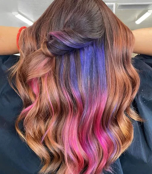 Еще одно ультрапопулярное окрашивание 2021 года — скрытое. Его смысл в том, что все метаморфозы происходят на нижнем слое волос, оставляя верхний без изменения. Таким образом, если уложить волосы прямо (без пышных кудрей, сложных проборов и причесок), то окрашивание вовсе не будет видно. «Скрыть» таким образом можно любой цвет, однако чаще это все же очень яркие оттенки. Самый большой минус этого окрашивания: яркие цвета быстро смываются, а волосы без должной укладки выглядят так, как будто их покрасили неаккуратными пятнами,