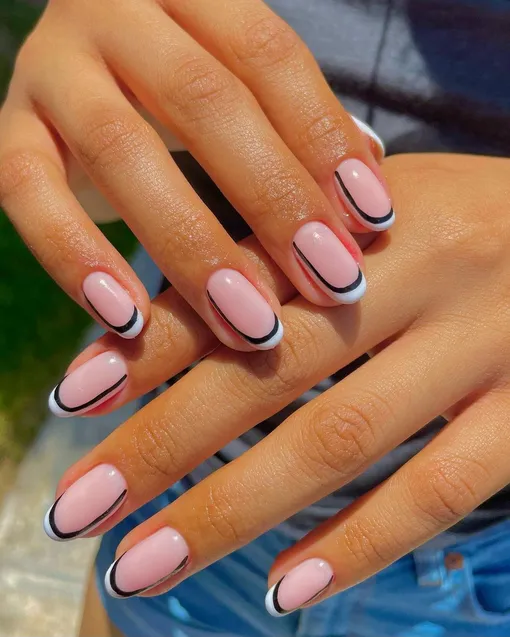 Как несложно догадаться из названия, «двойной» френч подразумевает, что контрастная полоска на кончике ногтя будет не одна. При этом вариаций исполнения трендового дизайна существует огромное множество. Самый простой способ — добавить вторую полосу, идеально повторяющую форму первой. Они могут близких оттенков одного цвета или контрастными.