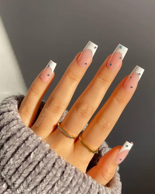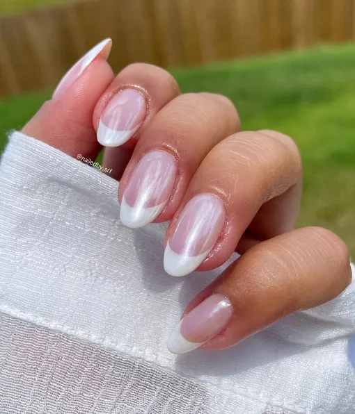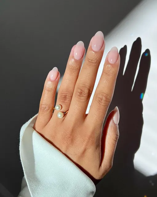 Название у этого маникюра говорящее: вам необходимо будто покрыть ногти молоком, чтобы переход между основной частью ногтя и его кончиком стал менее заметным. Есть несколько вариантов исполнения этого маникюра. Первый подойдет обладательницам натуральных длинных ногтей: на них контрастный кончик появляется сам собой. В этом случае вам нужно лишь полностью покрыть ногти полупрозрачным розовым или бежевым лаком, который сгладит контраст и сделает переход более плавным, но при этом полностью не скроет.