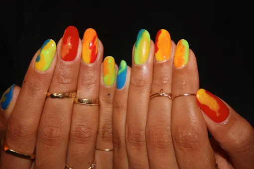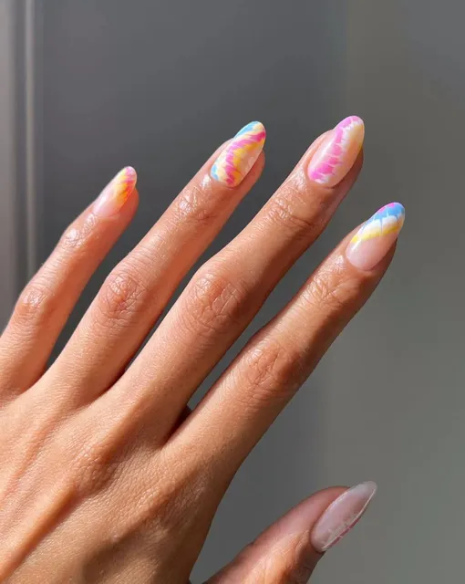 Техника тай-дай появилась очень давно, но в первую очередь она ассоциируется у нас с эпохой хиппи. А вот возродился тренд на этот узор в 90-е. Если вещи, окрашенные в такой технике, вас не привлекают, то попробуйте сделать этот узор на ногтях. Идеально для весенне-летнего сезона.