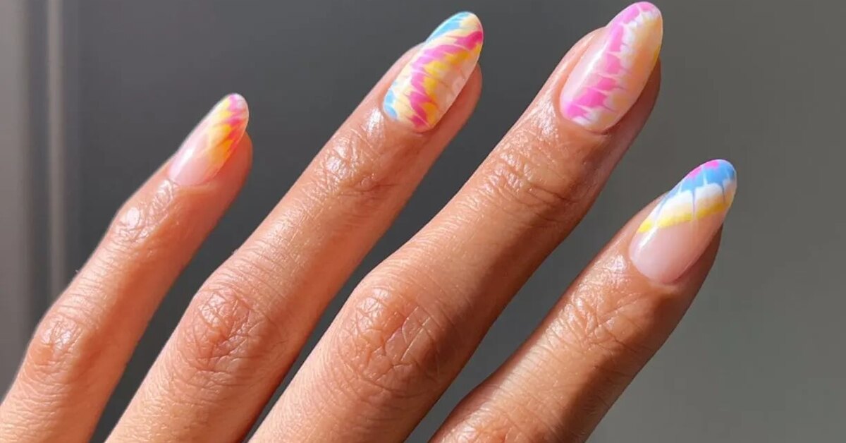 Техника тай-дай появилась очень давно, но в первую очередь она ассоциируется у нас с эпохой хиппи. А вот возродился тренд на этот узор в 90-е. Если вещи, окрашенные в такой технике, вас не привлекают, то попробуйте сделать этот узор на ногтях. Идеально для весенне-летнего сезона.
