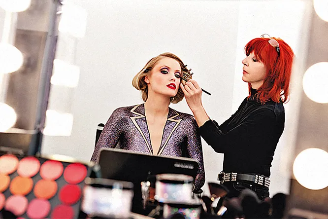 Подведите верхнее и нижнее веко с помощью Artist Liner, добавьте во внутренние уголки глаз немного золотых блесток (Glitter №3) и хорошенько прокрасьте ресницы черной тушью Smoky Extravagant – она обеспечит как объем, так и длину.