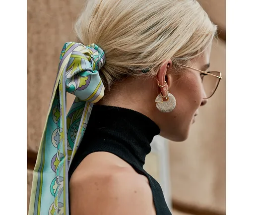 Широкая лента может быть любой расцветки, с самыми разными принтами — можно обзавестись несколькими и подбирать под каждый образ новую. Вплетать в косу, обрамлять высокий хвост или повязывать вместо ободка — воплощайте любые свои фантазии.