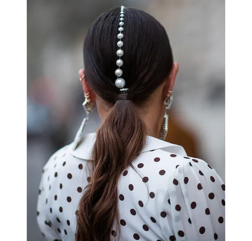 Шпильки для пучка, резинки и заколки с жемчужинами моментально преобразят любую прическу, придав ей особого шарма и нарядности. Можно ограничиться одной или двумя деталями, а можно украсить ими всю голову — например, если соберетесь на вечеринку с особым дресс-кодом.
