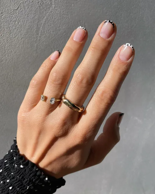 Неожиданно одним из самых актуальных принтов этого сезона стал горошек. Мы привыкли видеть его в весенне-летних коллекциях, однако в этом сезоне дизайнеры решили сделать исключение. Маникюр в горошек тоже моментально стал трендом, и если вы не готовы полностью покрывать ногти трендовым принтом, начать предлагаем с френча. Расцветку выбрайте любую: классическую черно-белую или цветную.