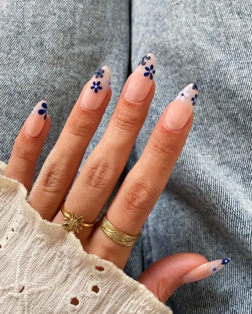 В выборе дизайна маникюра вас не должно ограничивать ничего. Единственной константой должны оставаться цветы, во всем остальном — просто дайте волю своей фантазии. Если привычные цветочные дизайны в нежных розовых тонах вам не по вкусу, обратитесь к более оригинальной цветовой гамме. Цветы могут быть темно-синими, коричневыми и даже черными — такие лучше всего расположить на прозрачной или нюдовой базе. Маникюр получится не только необычным, но и достаточно лаконичным и легко впишется в любой образ. Можно поступить обратным способом и изобразить цветы привычных оттенков на контрастной базе — глубокого винного или даже болотного цвета.