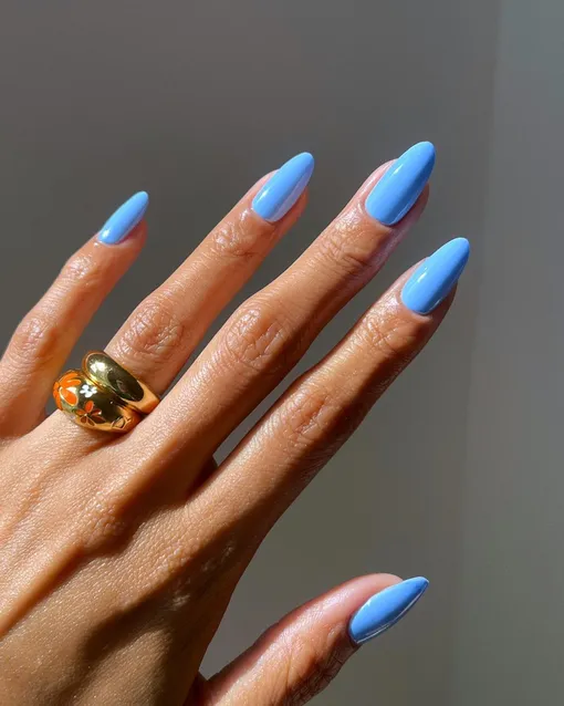 В этом сезоне нежно-голубой цвет заменил дизайнерам слегка надоевший за прошлый год красный. Одни бренды предлагают одеваться в него с ног до головы, другие — комбинировать голубой с другими трендовыми цветами. Впрочем, если в вашем гардеробе пока нет ни одной вещи голубого цвета, не беда. Всегда можно начать с маникюра. Лазурный цвет в маникюре можно использовать по-разному. Самый простой и вместе с тем эффектный вариант — однотонные покрытие. Голубой лак будет здорово смотреться на ногтях любой формы и длины и, несмотря на свою яркость, станет достаточно универсальным выбором и будет хорошо смотреться с одеждой буквально любых цветов. Маникюр станет яркой, но не кричащей изюминкой в образе. Экспериментируйте с финишем: он может быть глянцевым, матовым, «бархатным» или «металлическим» — здесь выбор за вами.