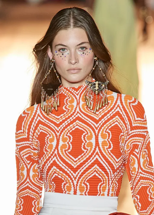 Еще один вариант эффектного макияжа под глазами — блестки и стразы. Особенно актуальным такой образ станет в период новогодних праздников, хотя стилисты бренда Etro предлагают носить его в сезоне весна-лето 2022. Не бойтесь экспериментировать: стразы не обязательно должны быть крупными и их не должно быть очень много. Достаточно расположить один или два в районе уголка глаза (внешнего или внутреннего — решайте сами). Также отлично подойдут для такого макияжа различные глиттеры и сухие блестки (только позаботьтесь о покупке качественной базы, которая позволит им держаться как можно дольше). И все — эффектный образ для вечеринки готов!