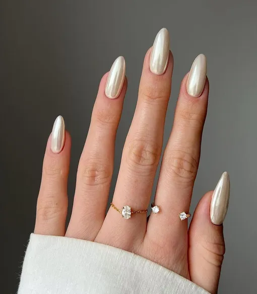 Название маникюра говорит само за себя: покрытие должно напоминать перламутровое сияние жемчуга. При этом вариантов исполнения существует великое множество. Первый — самый простой и, пожалуй, самый популярный — буквально превратить ногти в жемчужины. Для этого их необходимо покрыть полупрозрачным белым лаком, а затем нанести специальную жемчужную втирку. Ее отличают очень мелкие сверкающие частицы и деликатное сияние — прямо как у настоящего жемчуга.